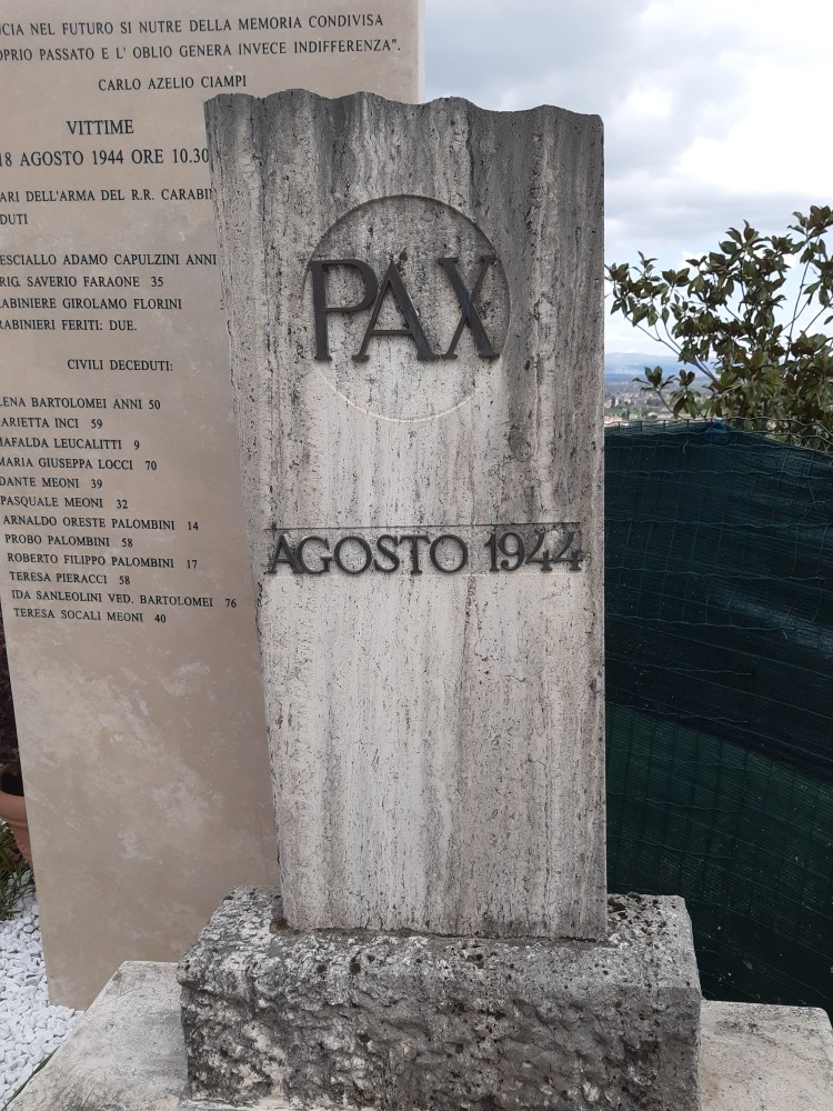 On the twenty-fifth of June, 1944 there was a skirmish between Fascist soldiers and Partisans in the vicinity of Anghiari. The following morning, a young Partisan volunteer was sent back to the area to determine whether the Nazis were still there. They were, and the unfortunate youth was captured to be taken to a nearby villa where he was placed against a wall, hands and feet tied, while the Germans continued to beat him. Before long, several other prisoners were brought to the villa and the Germans decided to execute all of them. Using available materials, the soldiers built a gallows from a tree trunk supported by two columns. Wire attached to the trunk was slipped over the heads of the young men and, assuming the standard Nazi method for hanging, a platform below the victims was removed to initiate the grisly death by strangulation. Perhaps mercifully, the soldiers became impatient with the slow process and shot the young men to end their struggles, leaving the bodies in place with a sign attached warning, “Partisans Punished.” Not until British troops arrived twenty days later were the bodies taken down and interred.