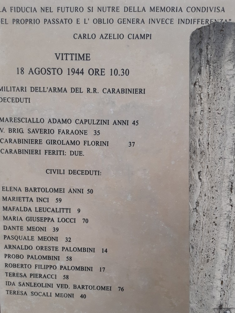 On August 18, 1944, at 10:30 a.m., some three weeks after the Germans departed, and two days after Anghiari had been designated liberated, a massive explosion shook Anghiari. Had we been living in our house then we would have heard the roar, felt the tremors, and seen the smoke rising from the site just below us. Now known as the Caribinieri Barracks Massacre, a bomb placed in the barracks had exploded killing fifteen people and seriously injuring others. Three of the dead were Caribinieri and twelve others civilians, some of whom were crushed as the buildings collapsed.