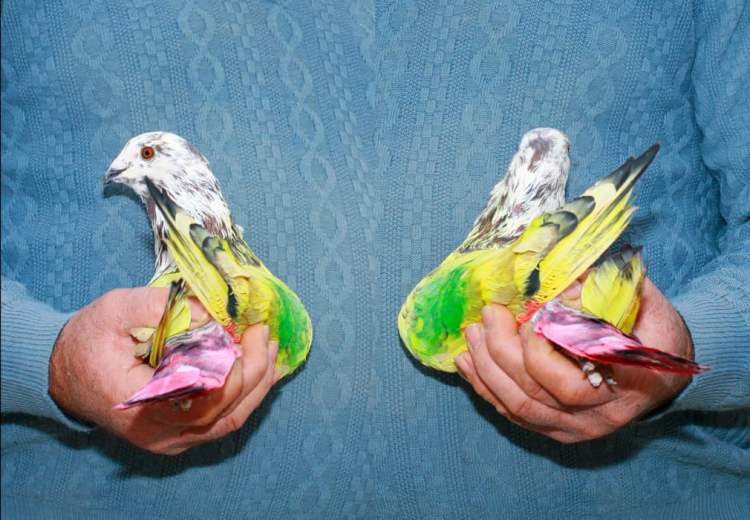 In the Spanish provinces of Valencia and Murcia some pigeon aficionadoes have developed the most unusual, and to my mind somewhat callous pigeon hobby. Enthusiasts of the sport paint their prize pigeons in bright colors, preparing them for a competition in which a bevy of males are released to pursue a single female pigeon. The male who succeeds in spending the greatest amount of time wooing the beleagured and probably very weary female is deemed the winner. 1